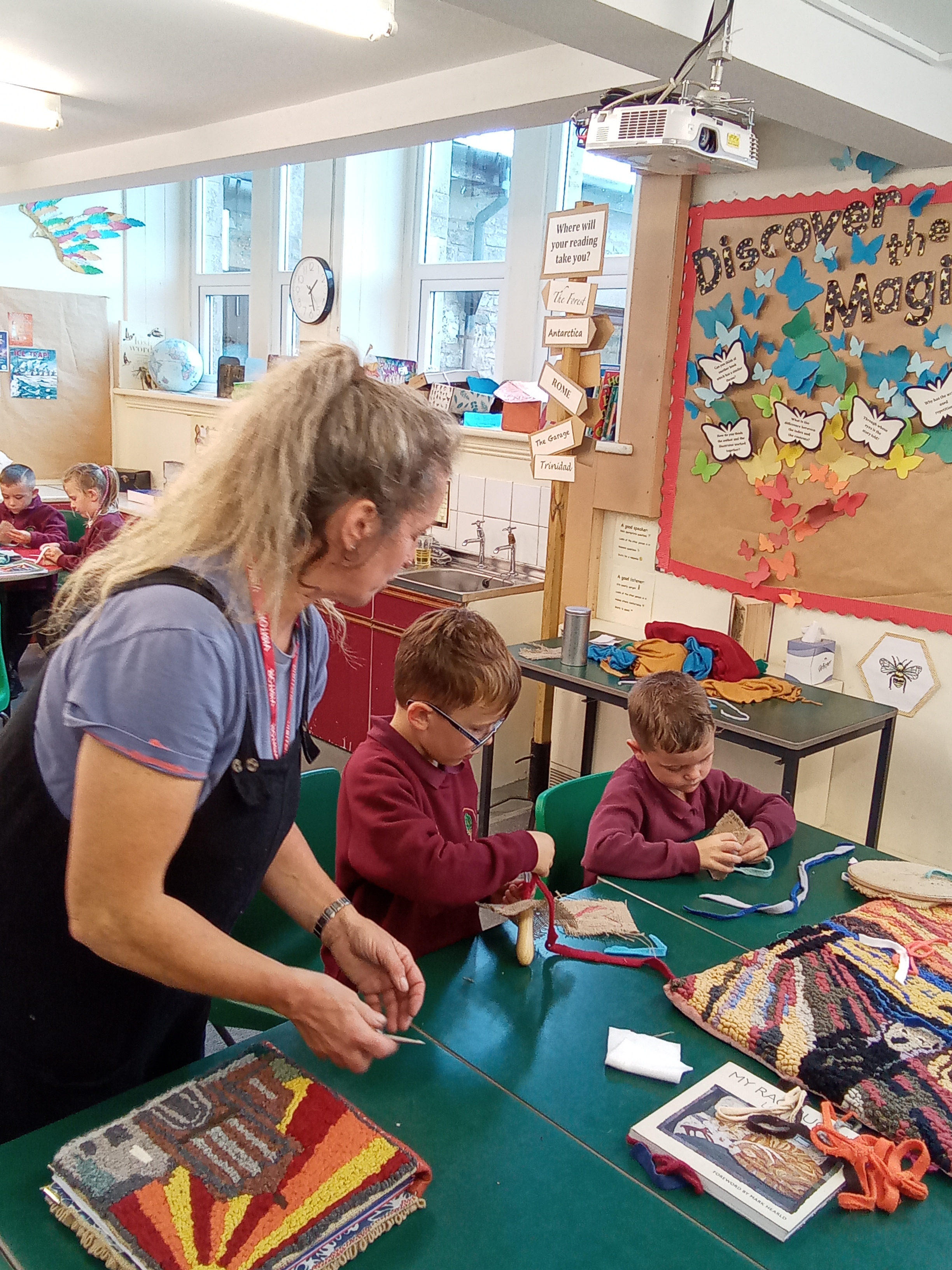 September 2025 - As part of 'The Vision and Values' week, the children worked with The Rag Tag workshop,Craft Shop Kendal | Ragtag Arts & Community Scrapstore learning how to rag rug. The rug will eventually portray the school logo, to display in school.